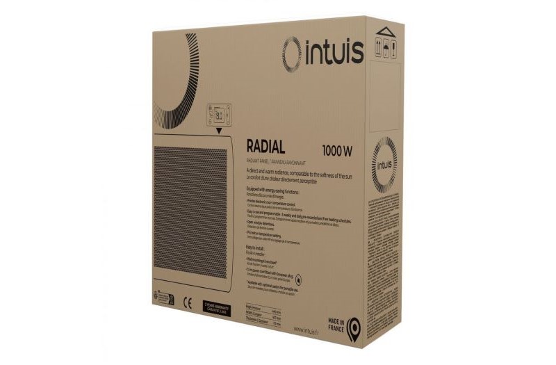Intuis RADIAL 1500 – електричний інфрачервоний обігрівач потужністю 1500 Вт з кабелем живлення, довжиною 1,5 м, штепсельною Евро вилкою та кронштейном для монтажу приладу на стіну. Обігрівач має електронний програмований термостат з функцією економії електроенергії, захисту від дітей та функцією відкритого вікна та інші. За рахунок патентованого нагрівального елементу Intuis, економія при використанні становить більш ніж 35%. ККД обігрівача є 99%. Додатково, для мобільного використання обігрівача Intuis RADIAL 1500, можливо використовувати підставку на колесах.