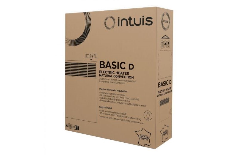 Basic D – наступний крок в розвитку електричних конвекторів. Конвектор Intuis Basic D 1500W має потужність 1500 Вт. До складу приладу входять: – кабель живлення, довжиною 1,5 м з штепсельною Euro вилкою; – монтажна рамка для монтажу конвектора на стіну. Має електронний програмований термостат з вільним розкладом програмування на кожний день. Пре закладені 3 програми спрощують програмування термостату. Має функції економії електроенергії, захисту від дітей, відкритого вікна та інші. Як додаткове обладнання використовуюся ніжки на колесах (не входить в комплект поставки). Товщина конвектора становить 104 mm.